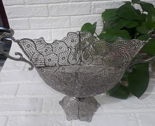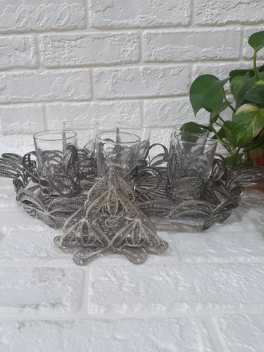 ست فنجان و سینی پذیرایی و جا دستمالی مس ملیله آبکاری نقره